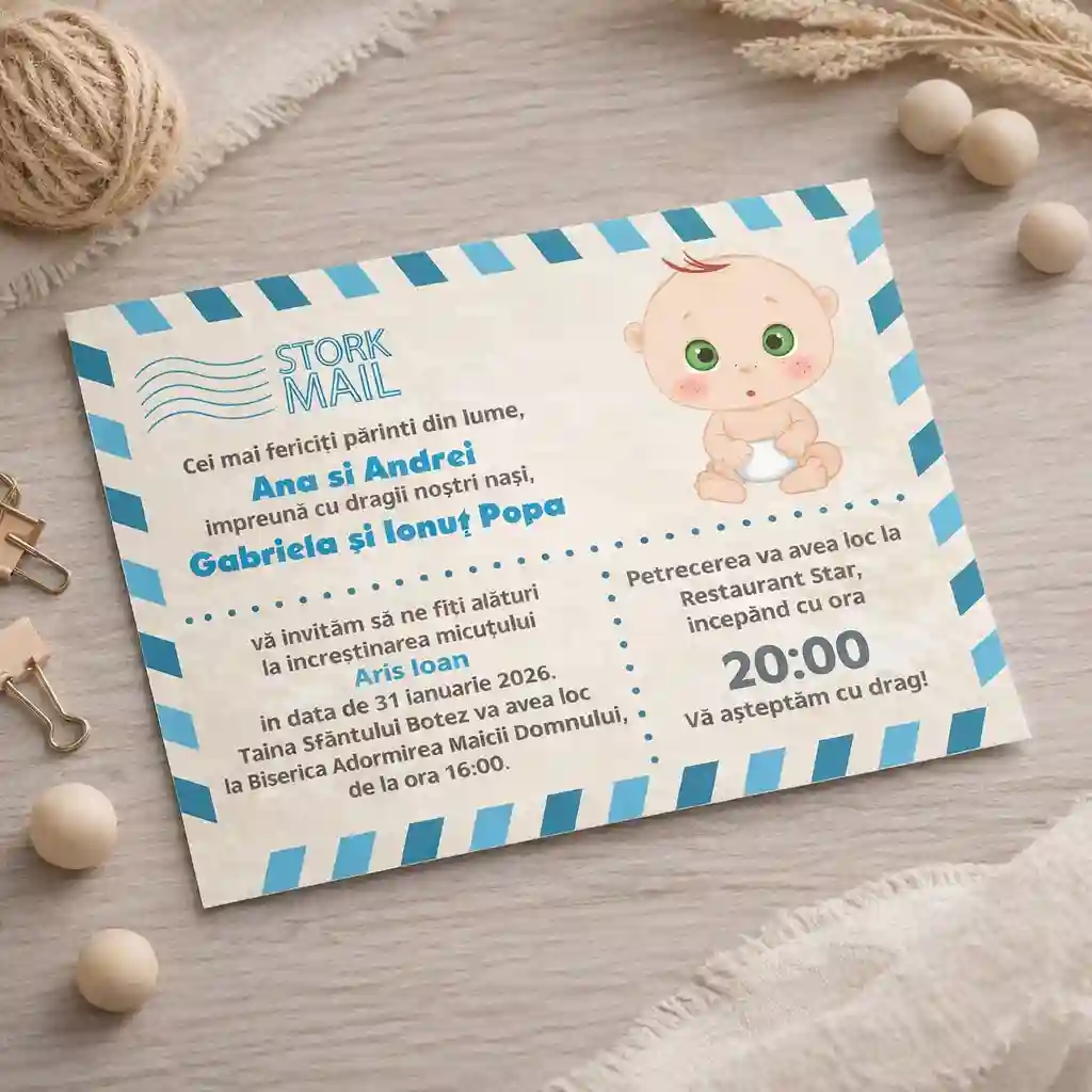 Alege eleganța simplității cu aceste invitații de botez tip carte poștală (Model 3 băiețel). Un design modern, aerisit și ușor de expediat, ideal pentru părinții care doresc un anunț stilat și practic. Tipărite pe hartie foto premium, aceste invitații îmbină nostalgia clasică a cărții poștale cu emoția unui eveniment unic.