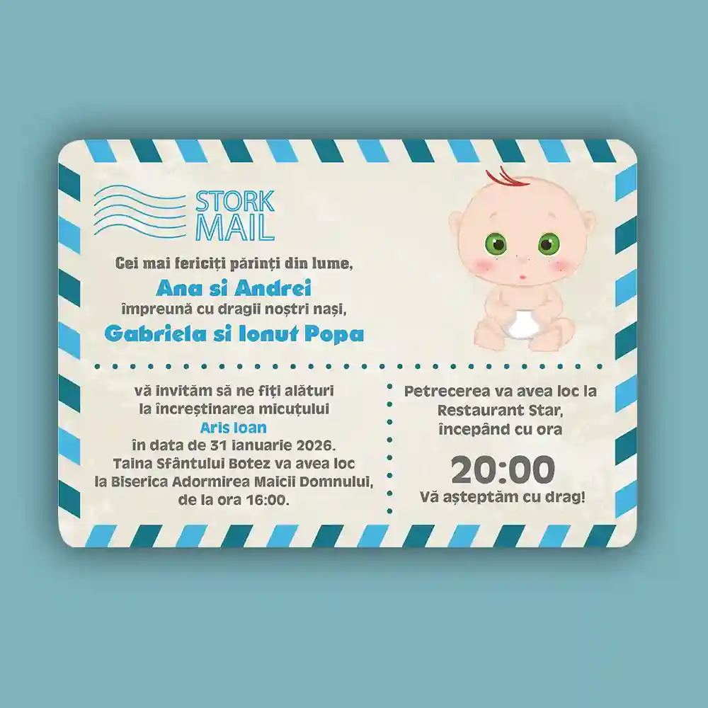 Invitații Botez Carte Poștală Model 3 băietel – Design Elegant